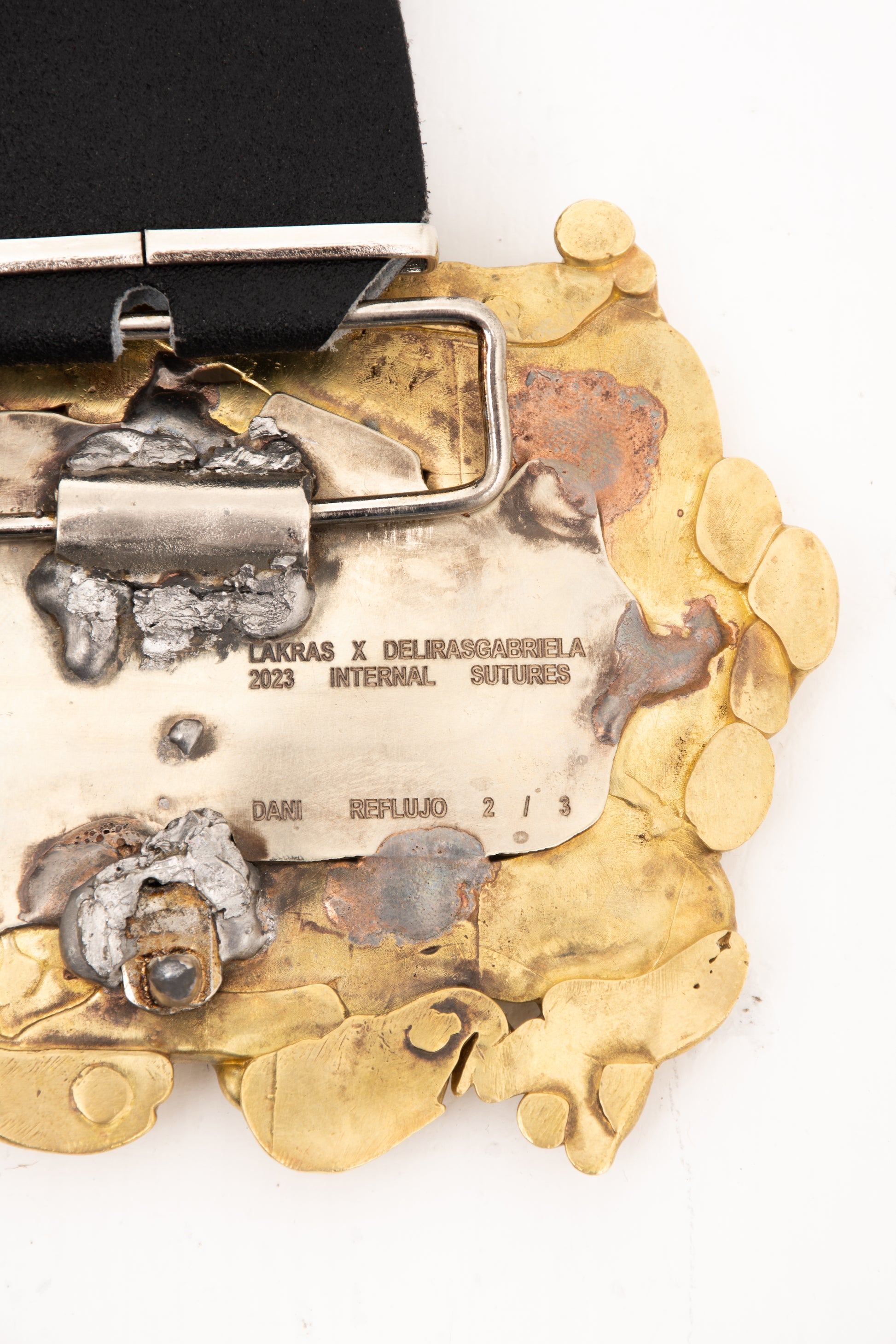 Correa artesanal de Lakras. Para la creación de la placa se siguió la técnica indígena precolombina de cera perdida y se fundió en bronce y alpaca (un metal que surge de combinar cobre y plata). Cada una de las correas representa algo que simboliza la vida del vampiro: